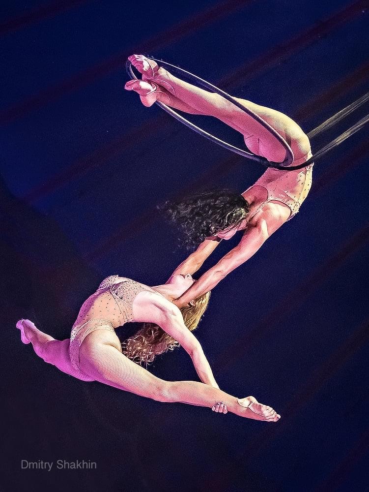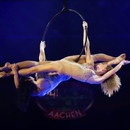 Romantik liegt in der Luft, sobald Marika und Rochelle die Manege betreten. Leicht wie zwei im Wind tänzelnde Federn erheben sie sich an ihrem Ring hoch unter die Kuppel des Berliner Tempodroms. Beide Künstlerinnen sind klassisch ausgebildete Balletttänzerinnen und blicken bereits auf eine erfolgreiche internationale Karriere zurück. So tanzte Rochelle Berwick unter anderem für das Los Angeles sowie das Bolshoi Ballet, bevor sie 2015 zur Circuskunst wechselte. Marika Ashley war mit renommierten Ballettkompanien in San Diego, Nevada und New York zu Gast. Mit ihrer Luftring-Choreografie, die gekonnt die Kraft der Akrobatik mit der Präzision und Kunstfertigkeit des Romantischen Balletts vereint, treten sie erstmalig in Berlin auf.